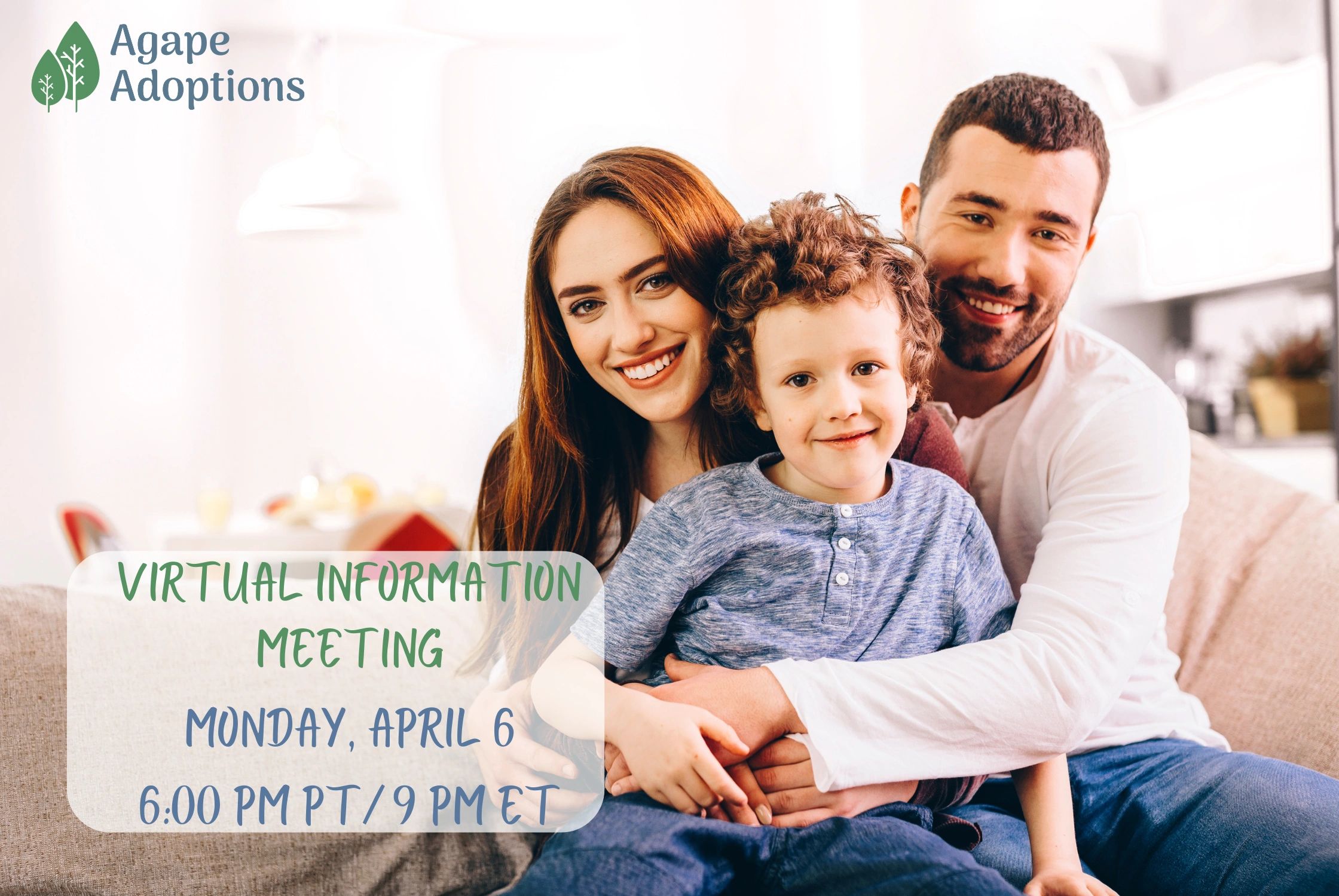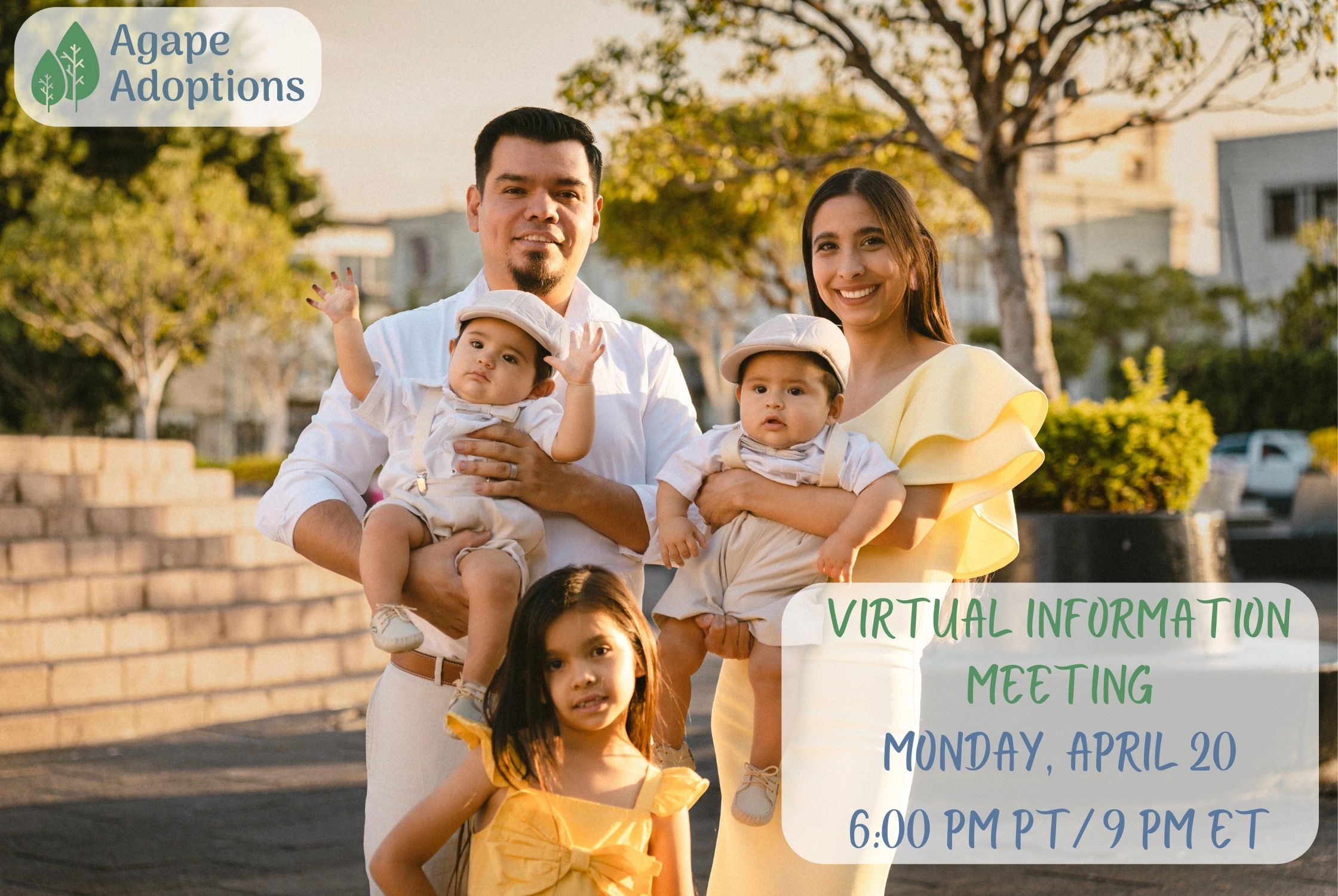 Interested in adoption but don't know where to start? Attend our free information meeting on Monday, April 6, 6 pm PT/9 pm ET. Myriam Avery, Agape Adoption's Executive Director will go over the steps in the international adoption process, review financing options, and highlight our adoption programs.